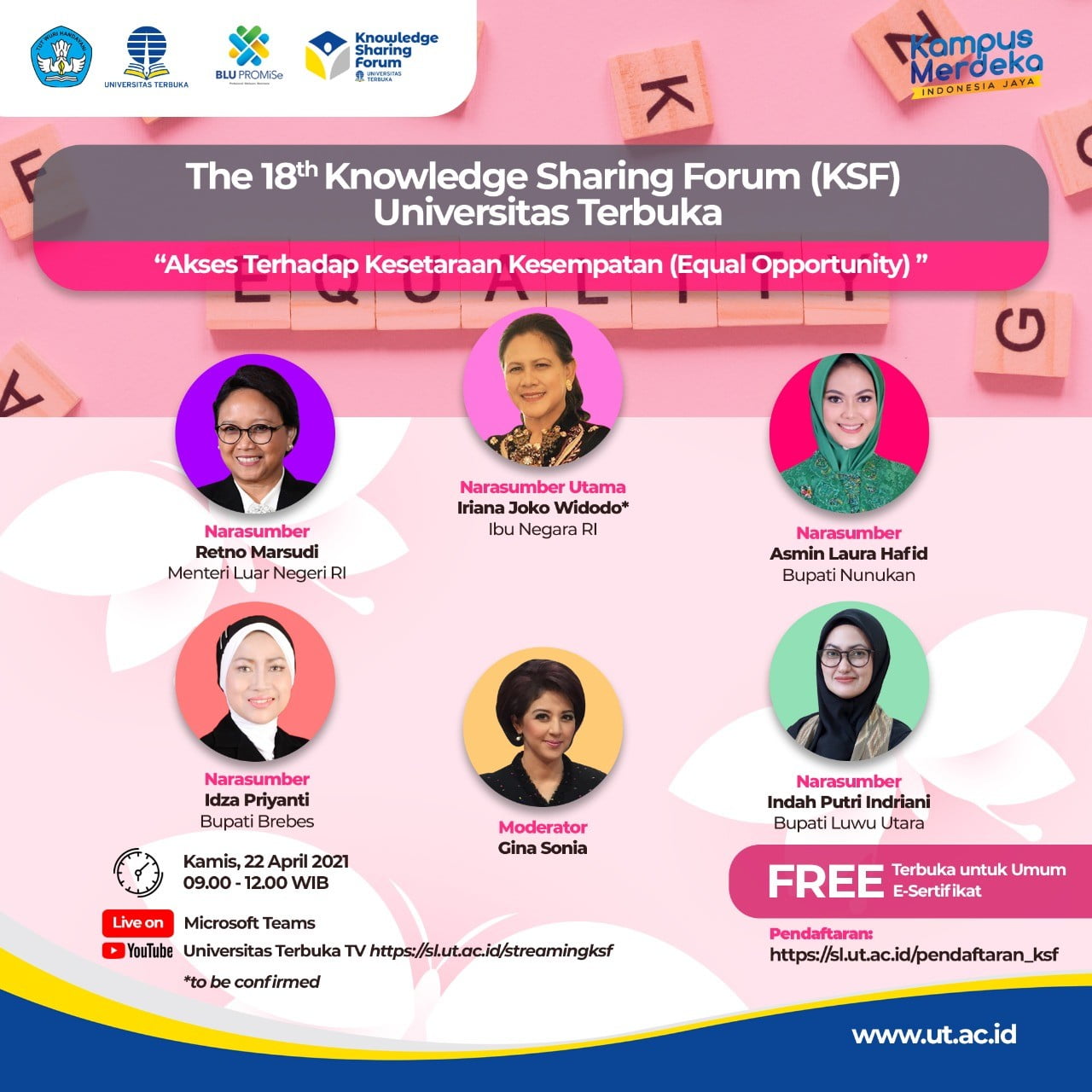Dalam rangka meningkatkan pemahaman dan pengetahuan tentang sistem, teknologi, dan pengelolaan Program Pendidikan Jarak Jauh bagi para dosen, mahasiswa, dan masyarakat, Universitas Terbuka (UT) menyelenggarakan kegiatan Knowledge Sharing Forum (KSF) UT tahun 2021 secara virtual dengan berbagai topik tentang Open, Online and Distance Learning.