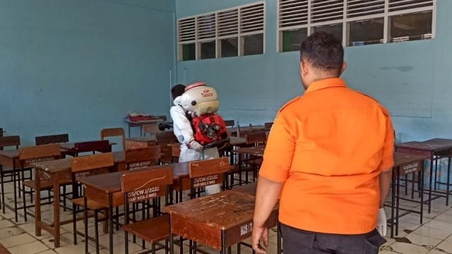 Penyemprotan disinfektan dilakukan personil TRC BPBD Makassar dengan menyisir seluruh halaman sekolah, ruang guru, ruang kelas, dan area publik lainnya.
