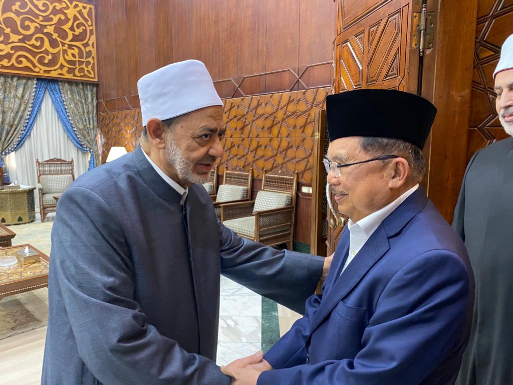 ONLINE24, KAIRO – Wakil Presiden RI ke-10 dan 12, Jusuf Kalla mengadakan kunjungan balasan ke Grand Syaikh Al-Azhar, Prof. Dr. Ahmad Thoyib di kantornya di Kairo, Rabu (5/10) sore.