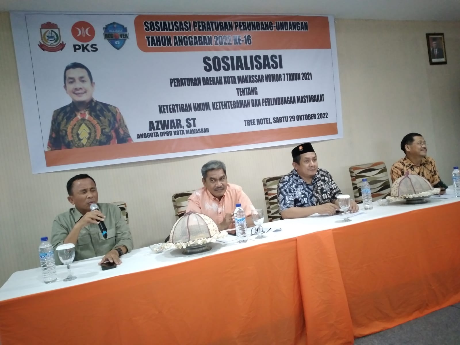 Online24, Makassar – Anggota DPRD Kota Makassar, Azwar menggelar Sosialisasi Peraturan Daerah (Perda) nomor 7 tahun 2021 tentang Ketertiban Umum, Ketentraman dan Perlindungan Masyarakat di Hotel Tree, Sabtu (29/10/2022).