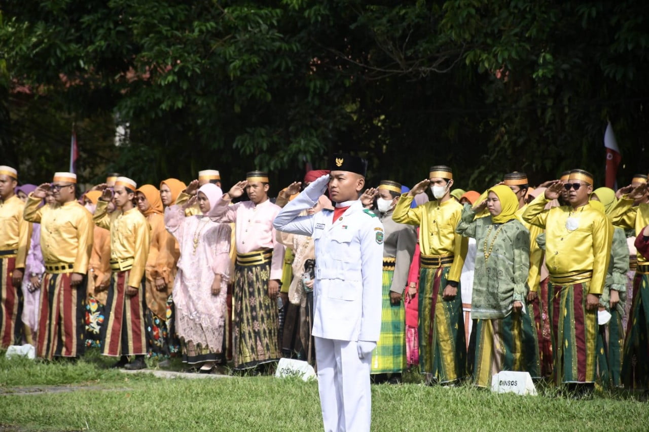 Bertindak sebagai inspektur upacara (irup), Wakil Bupati Suaib Mansur yang juga tampak mengenakan pakaian adat. Pun dengan pejabat lainnya yang terlihat hadir, seperti Sekretaris Daerah Armiadi, para Kepala Perangkat Daerah serta unsur Forkopimda lainnya.