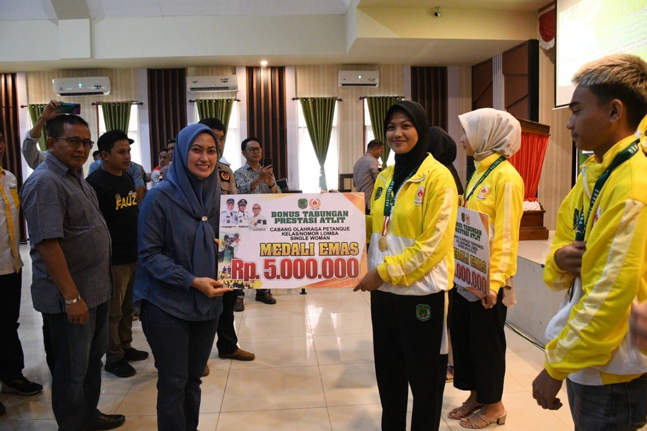 Penyerahan bonus tersebut langsung kepada para atlet perai medali baik itu emas, perak dan perunggu. Dalam sambutanya, Bupati Luwu Utara Indah Putri Indriani menyampaikan, pada laga Porprov 2022 yang digelar di dua kabupaten yakni Sinjai dan Bulukumba menjadi sejarah baru bagi Luwu Utara.