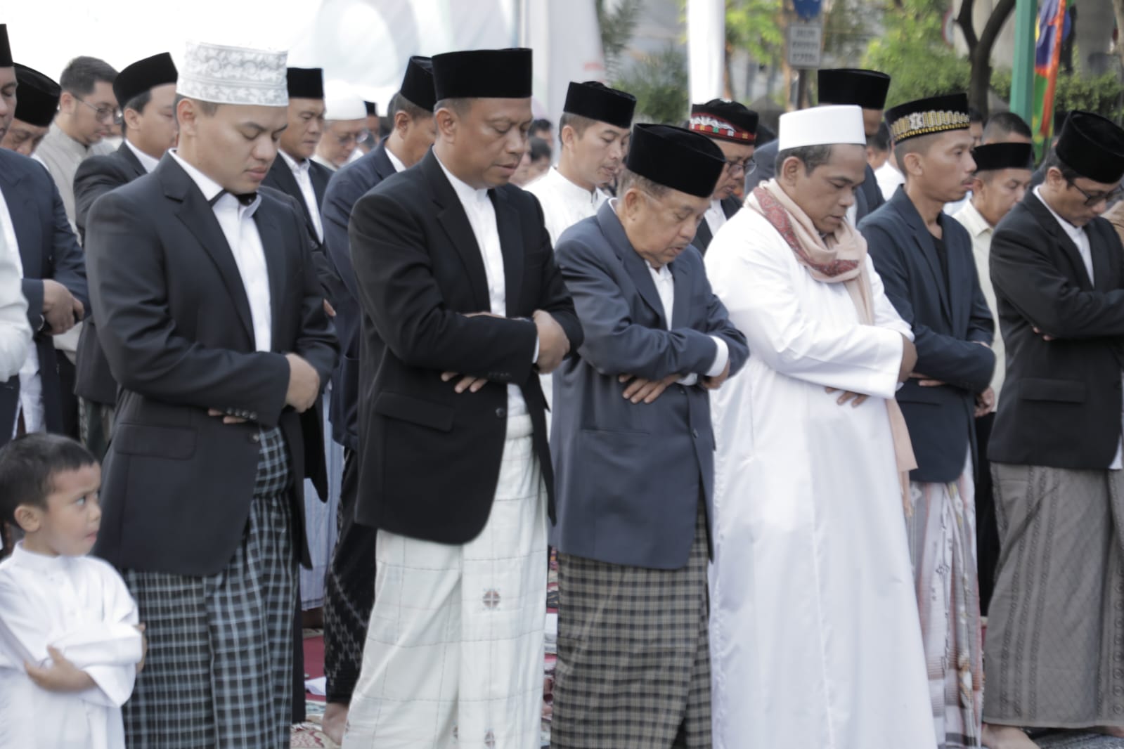 Saat melaksanakan sholat id JK tampak duduk berdampingan dengan Walikota Jakarta Selatan Munjirin, S sos,Msi serta unsur forkopimda Jakarta Selatan.