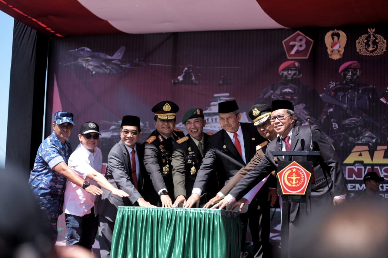 Online24jam, Makassar, – Meriahkan Hari Ulang Tahun (HUT) ke-78 TNI Tahun 2023, Pangdam XIV/Hasanuddin Mayjen TNI Dr. Totok Imam Santoso, S.I.P., S.Sos., M.Tr (Han)., bersama Danlantamal VI Makassar Laksma TNI Ivan Gatot Prijanto, S.E., M.Tr. Opsla., dan Ir Koopsud II Marsma TNI Zulfahmi, S.Sos., M.Han., didampingi unsur Forkopimda Sulsel, ditandai penekanan tombol secara resmi membuka Pameran Alutsista dengan tema “TNI Patriot NKRI Pengawal Demokrasi Untuk Indonesia Maju”, bertempat di Anjungan Pantai Losari Makassar. Minggu (1/10/2023).