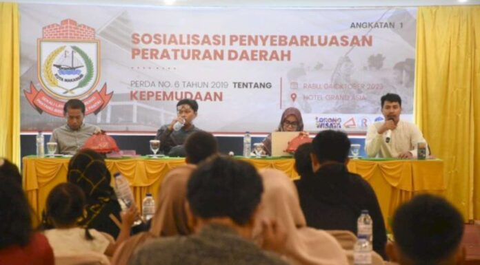 Online24, Makassar – Sekretariat DPRD Makassar menggelar Sosialisasi Penyebarluasan Peraturan Daerah (Perda) Nomor 6 Tahun 2019 tentang Kepemudaan, di Hotel Grand Asia, Jalan Boulevard, Kota Makassar, Rabu 4 Oktober 2023.
