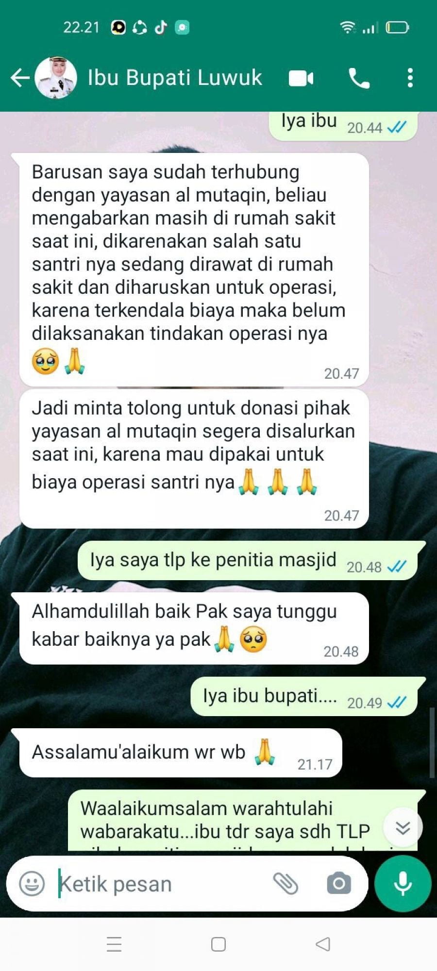 “Oknum yang menggunakan nomor tersebut mengaku sebagai ibu bupati dan menyebar pesan ke sejumlah orang via aplikasi WhatsApp. Oknum itu bermaksud menggalang donasi berupa uang untuk yayasan dan masjid,” kata Nursalim, Kamis (19/10).