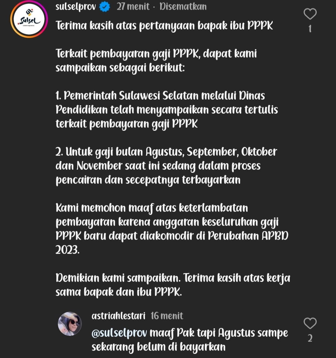 Postingan dengan tagar #humassulsel #dpmptspsulsel #dalaksulsel #sulselramahinvestasi #jayalahinvestasi #investasisulsel ini, dipenuhi oleh ratusan komentar yang hampir semua mempertanyakan honor atau gaji P3K yang belum cair.