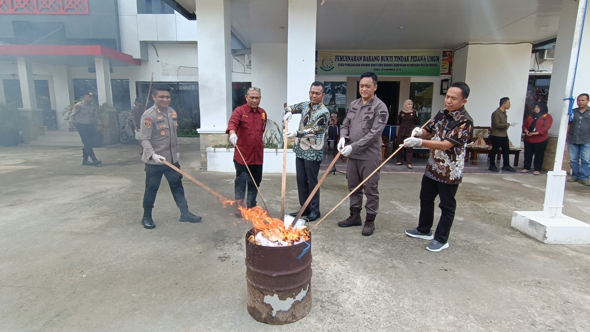“Barang bukti yang dimusnahkan merupakan barang bukti dari 18 perkara sejak bulan Agustus 2023 hingga November 2023 dengan rincian 11 perkara narkotika, 2 perkara Undang-Undang kesehatan, 2 perkara pencurian dan 3 perkara Undang-Undang darurat berupa senjata tajam (sajam),”jelasnya.