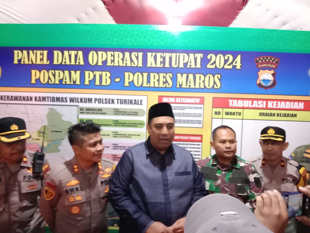 Online24,Maros – Bupati Maros Chaidir Syam bersama Forkopimda setempat melakukan pemantauan posko mudik di sejumlah titik di Wilayah Kabupaten Maros, Selasa 9 April 2024. A.S Chaidir syam didampingi oleh Kapolres Maros, AKBP Awaludin Amin dan Dandim 1422 Maros, Letkol Arm Nikolas Sirilus.