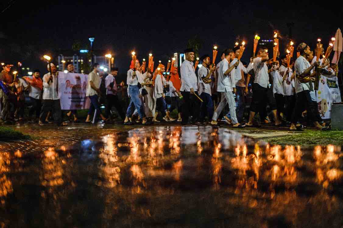 Dengan diiringi kumandang takbir, para peserta membawa obor yang menyala dan berjalan beriringan menuju Anjungan City of Makassar.