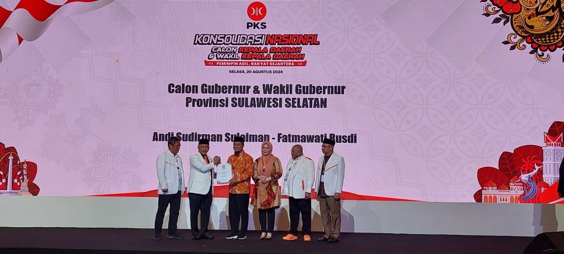 Bakal calon Gubernur dan Wakil Gubernur Sulsel, Andi Sudirman Sulaiman – Fatmawati Rusdi menerima formulir persetujuan partai politik atau B1 KWK dari Partai Keadilan Sejahtera (PKS). Penyerahan itu berlangsung pada Konsolidasi Nasional dalam Pilkada 2024 di ICE BSD, Kecamatan Pagedangan, Kabupaten Tangerang, Selasa, 20 Agustus 2024.