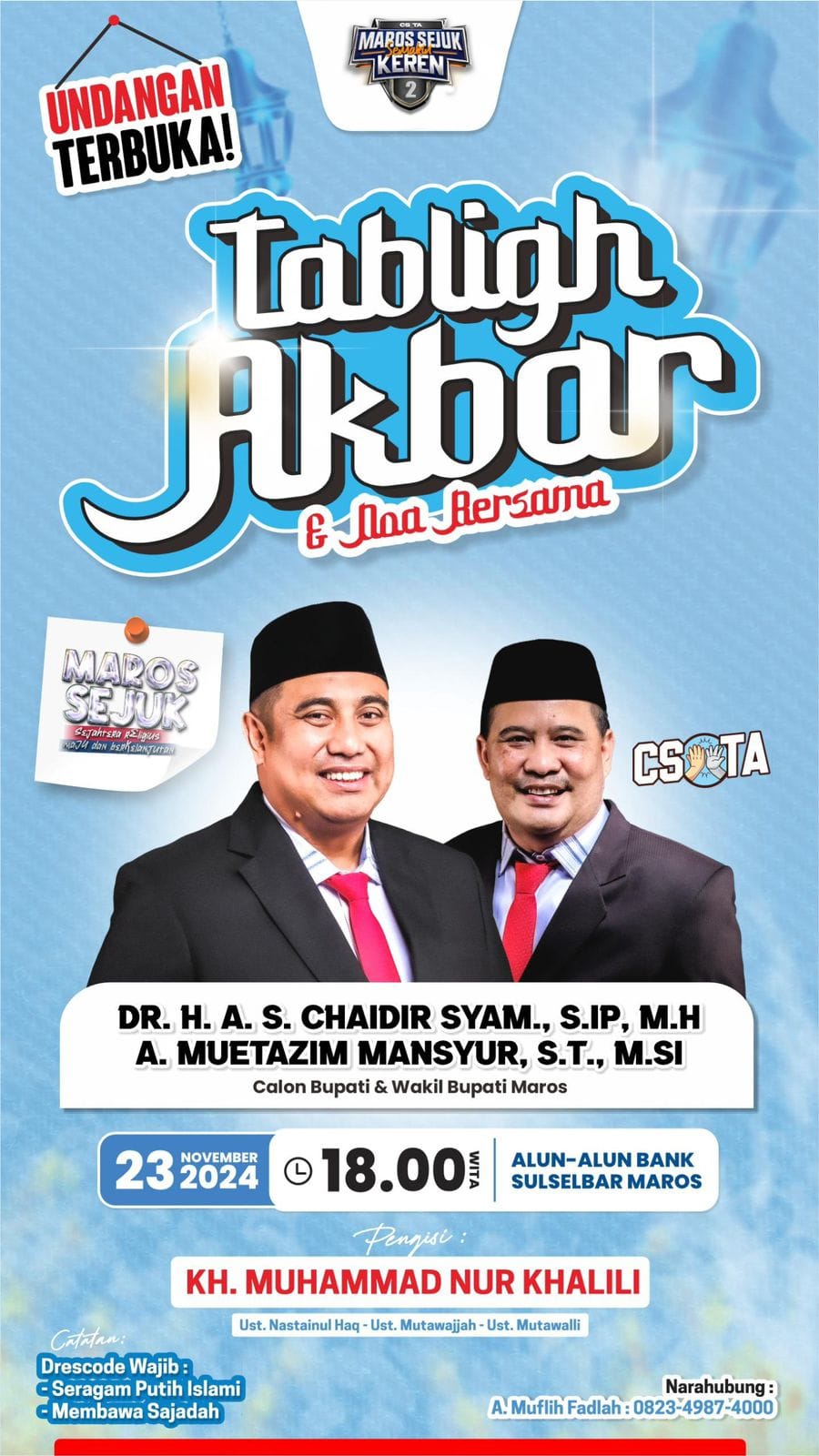 Online24,Maros – Pada hari terakhir kampanye Pilkada 2024, pasangan calon Bupati dan Wakil Bupati Maros nomor urut 2, Chaidir Syam-Muetazim Mansyur (CS Ta), akan menggelar Dzikir Akbar yang dijadwalkan pada Sabtu, 23 November 2024, di Alun-alun Bank Sulselbar, Kecamatan Turikale.