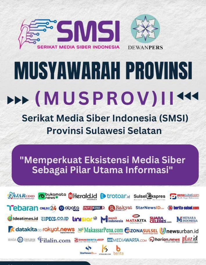 Online24, Makassar – Serikat Media Siber Indonesia (SMSI) Provinsi Sulsel akan menggelar musyawarah provinsi (musprov) ke II yang dilaksanakan di Hotel Swiss Belinn, Panakkukang, Makassar pada Sabtu 22 Februari 2025.