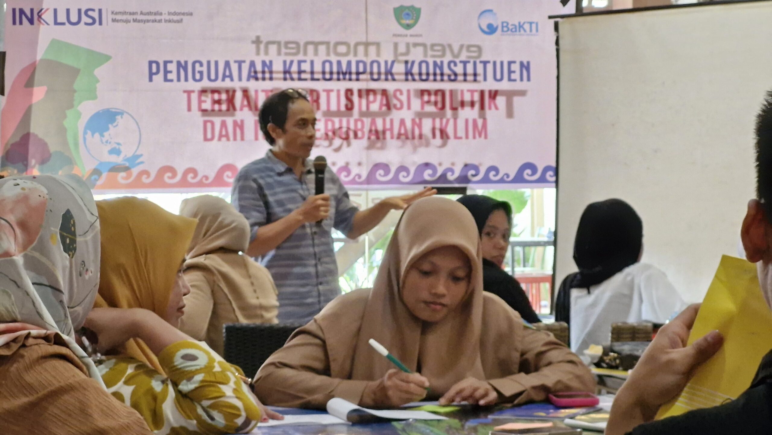 Koordinator Program INKLUSI Yayasan BaKTI, Ismawati, menyampaikan bahwa kegiatan ini bertujuan meningkatkan pemahaman kelompok konstituen dan pemerintah desa terkait partisipasi politik serta isu perubahan iklim.