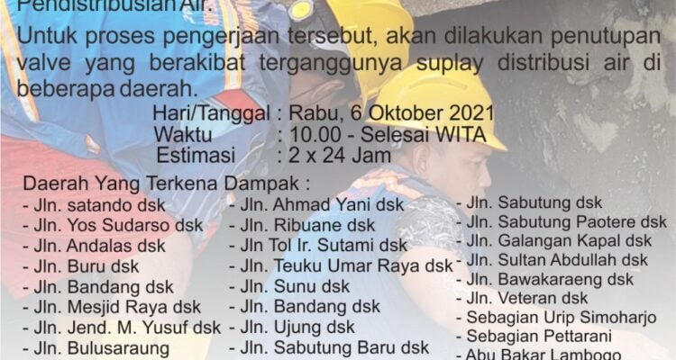 Besok PDAM Makassar Bakal Lakukan Pengerjaan Pembenahan Jaringan dan Pemerataan Pendistribusian AirNews, Regional|October 5, 2021October 5, 2021by Andhika IdrisOnline24, Makassar – Tim teknik Perumda Air Minum Kota Makassar akan melakukan pengerjaan